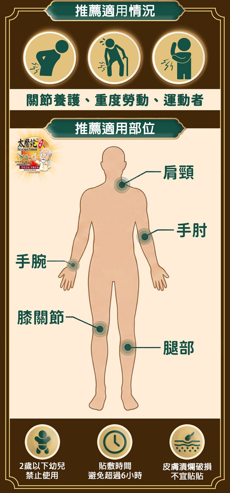 貼布:1.依使用部位情況增減使用次數,建議一片貼於皮膚4-6小時,休息1個小時,視情況再繼續貼用。2.請先將使用部位清潔乾燥後,再予貼上。