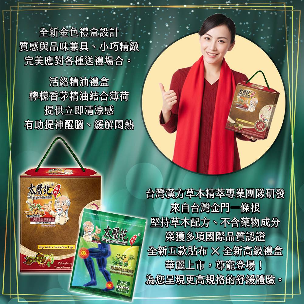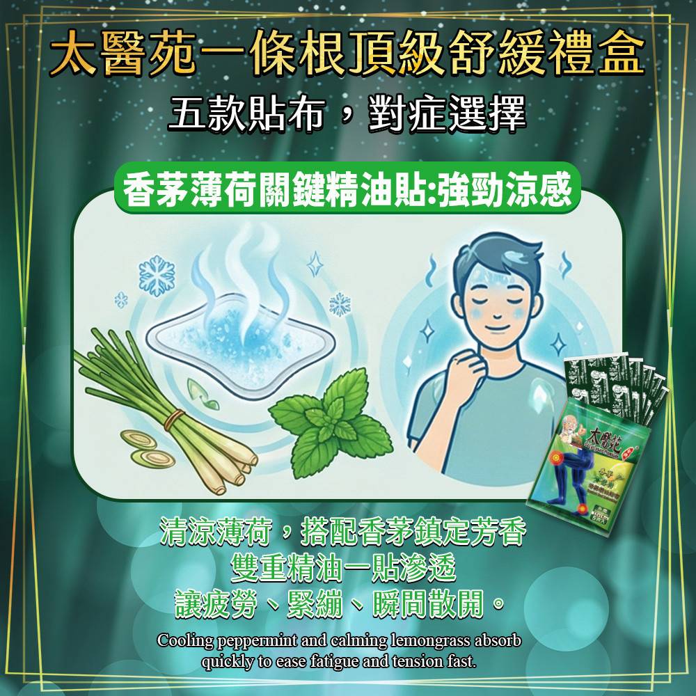 太醫苑一條根, 香茅薄荷貼布, 活絡精油貼布, 清涼舒緩貼布, 涼感關節貼, 腿部痠痛貼布, 久站久走腿痠, 上班族必備貼布, 提神醒腦涼感貼, 夏日消暑貼布, 草本精油貼布, 金色禮盒, 舒緩肌肉疲勞, 長輩保健禮盒, 企業贈禮推薦